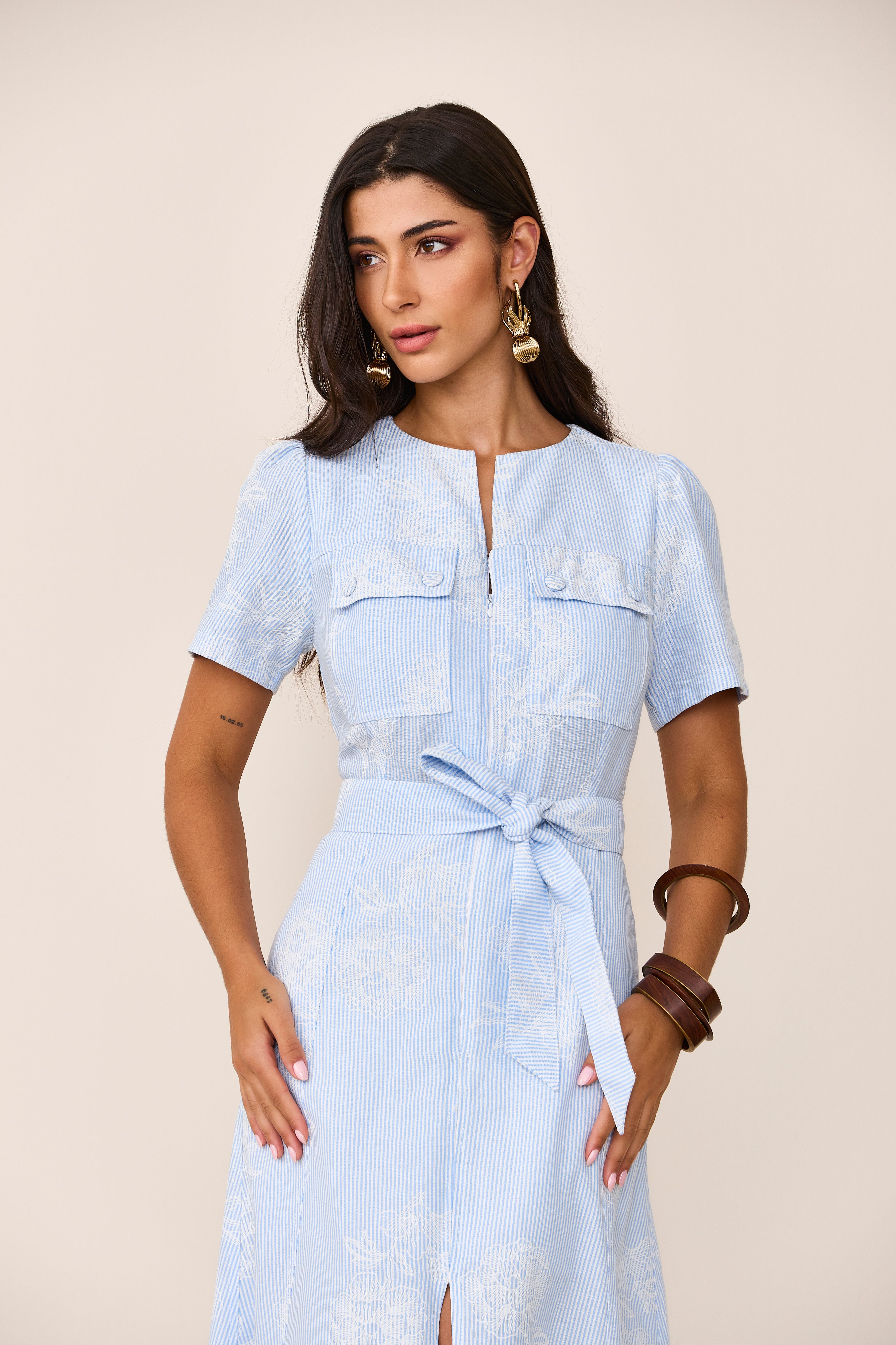 Vestido midi de mangas, com modelagem super elegante e tecido em listras delicadas. O bordado sofisticado traz um toque artesanal e refinado, enquanto o detalhe do zíper frontal adiciona modernidade à peça. Um modelo versátil e atemporal, perfeito para composições que unem charme e estilo. Acompanha faixa.
