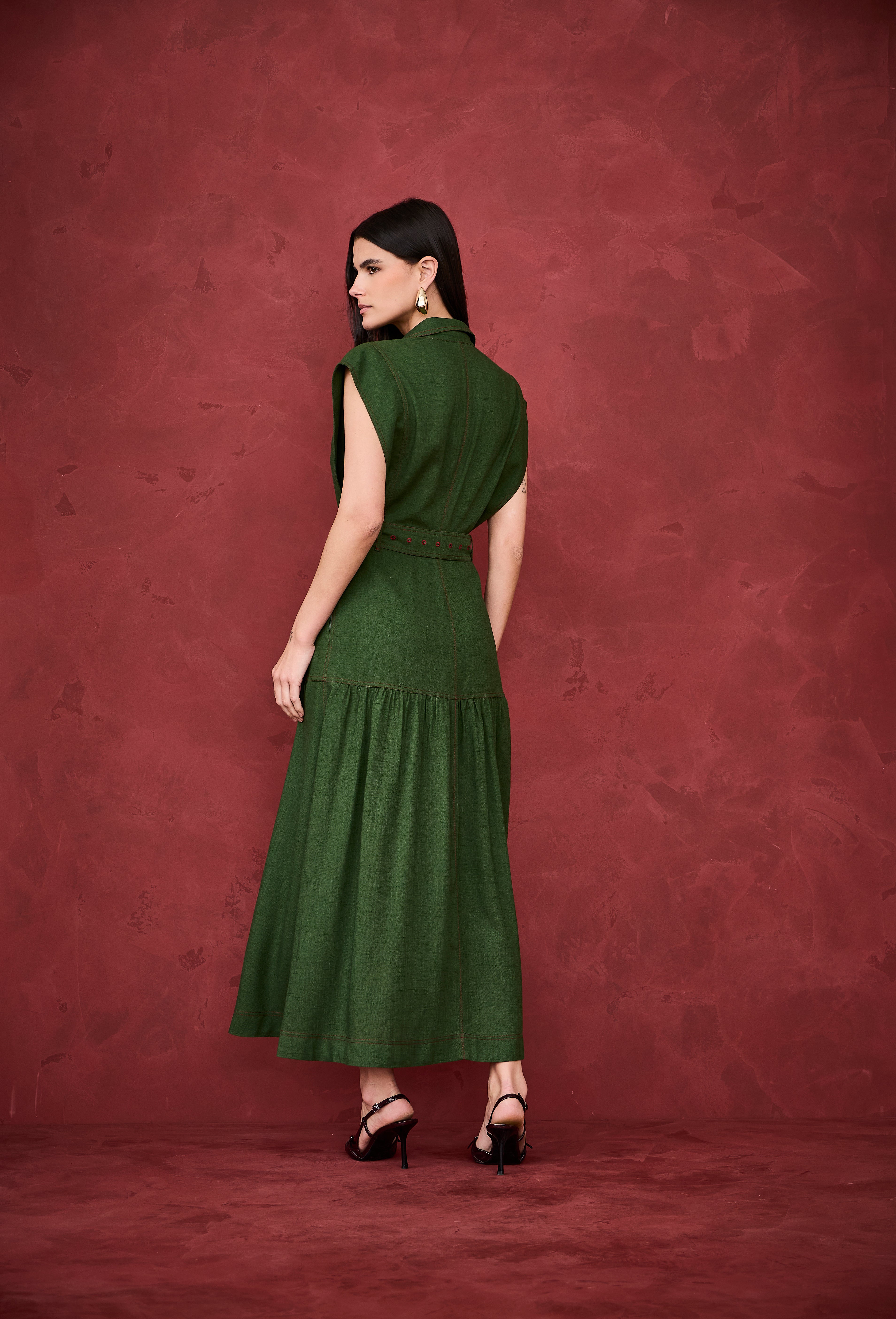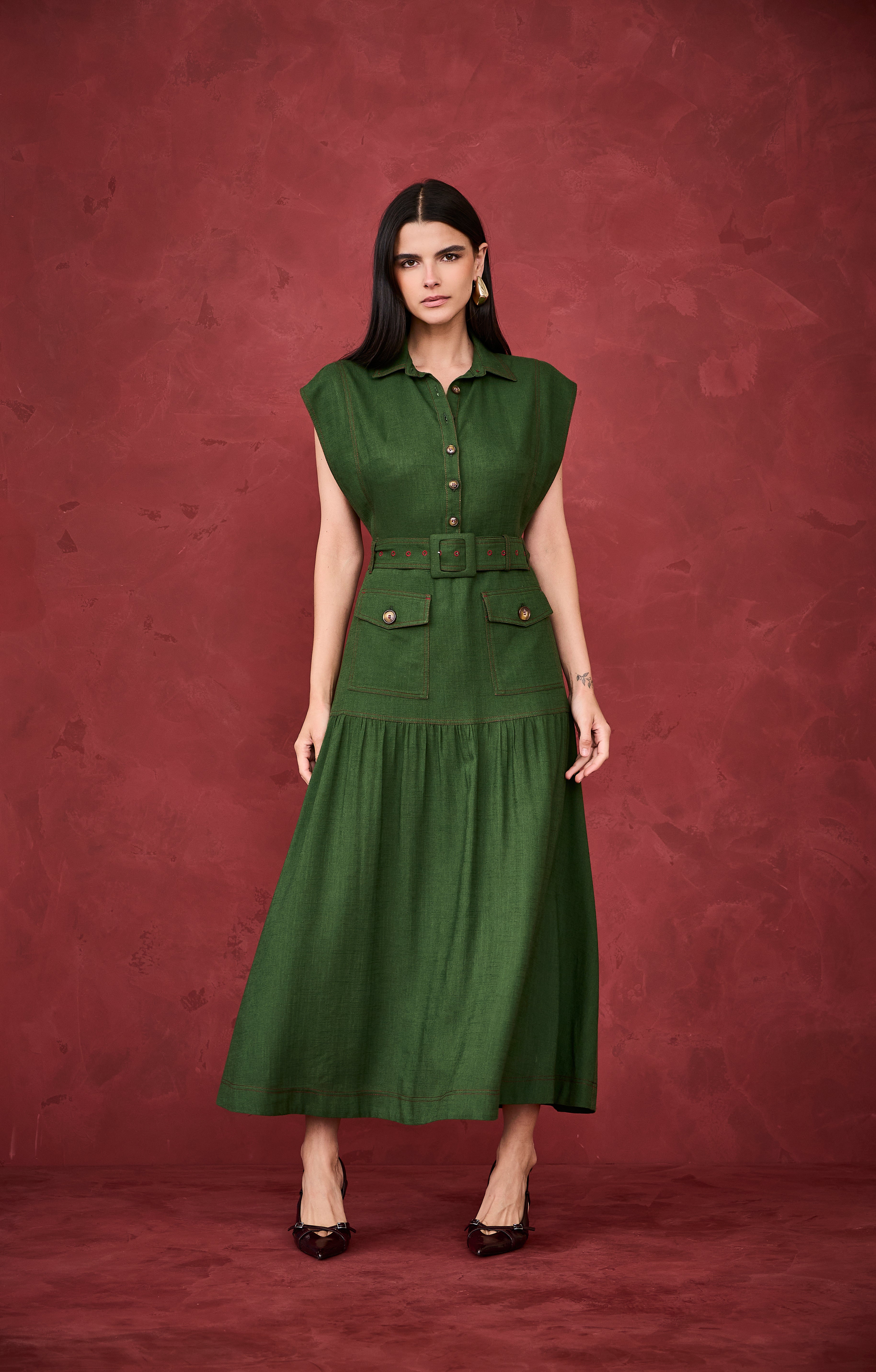 Vestido midi com design sofisticado e cheio de personalidade. Possui modelagem elegante, com fechamento frontal por botões, gola clássica e mangas levemente estruturadas. Acompanha cinto no mesmo tom, que valoriza a cintura, além de bolsos frontais funcionais que acrescentam charme ao visual. Com leve amplitude traz movimento e equilíbrio à peça, resultando em um vestido refinado, moderno e extremamente elegante.