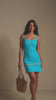 Vestido curto azul de alças, com bolsos laterais estilo cargo e detalhe de botões de madeira no busto. Um modelo leve e delicado, que une praticidade e charme em uma peça moderna e cheia de estilo.