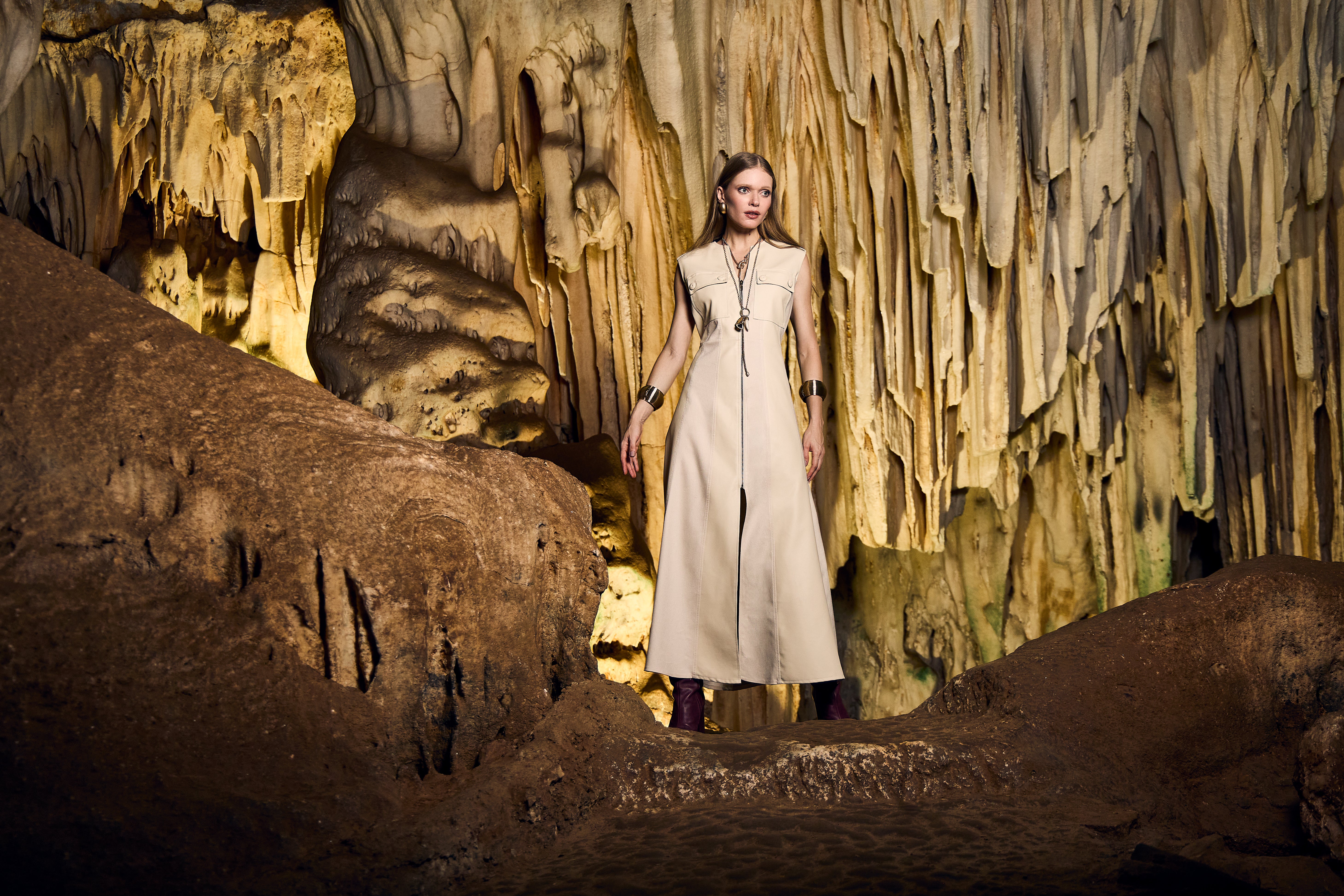 Vestido longo em mix de couro e linho no tom bege, com modelagem elegante e sofisticada. Possui zíper frontal que cria uma fenda sutil e charmosa, bolsos frontais com lapela, gola estruturada e recorte sem mangas que valoriza a silhueta. Acompanha faixa para amarração na cintura, trazendo ajuste perfeito e um toque moderno à peça. Ideal para produções elegantes e atemporais.
