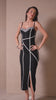 Vestido midi de alças em canelado power preto, que modela e valoriza a silhueta. Possui detalhes de vivos em branco e aplicação de elástico p&b no busto, trazendo um toque moderno e sofisticado. Uma peça super elegante e cheia de estilo.