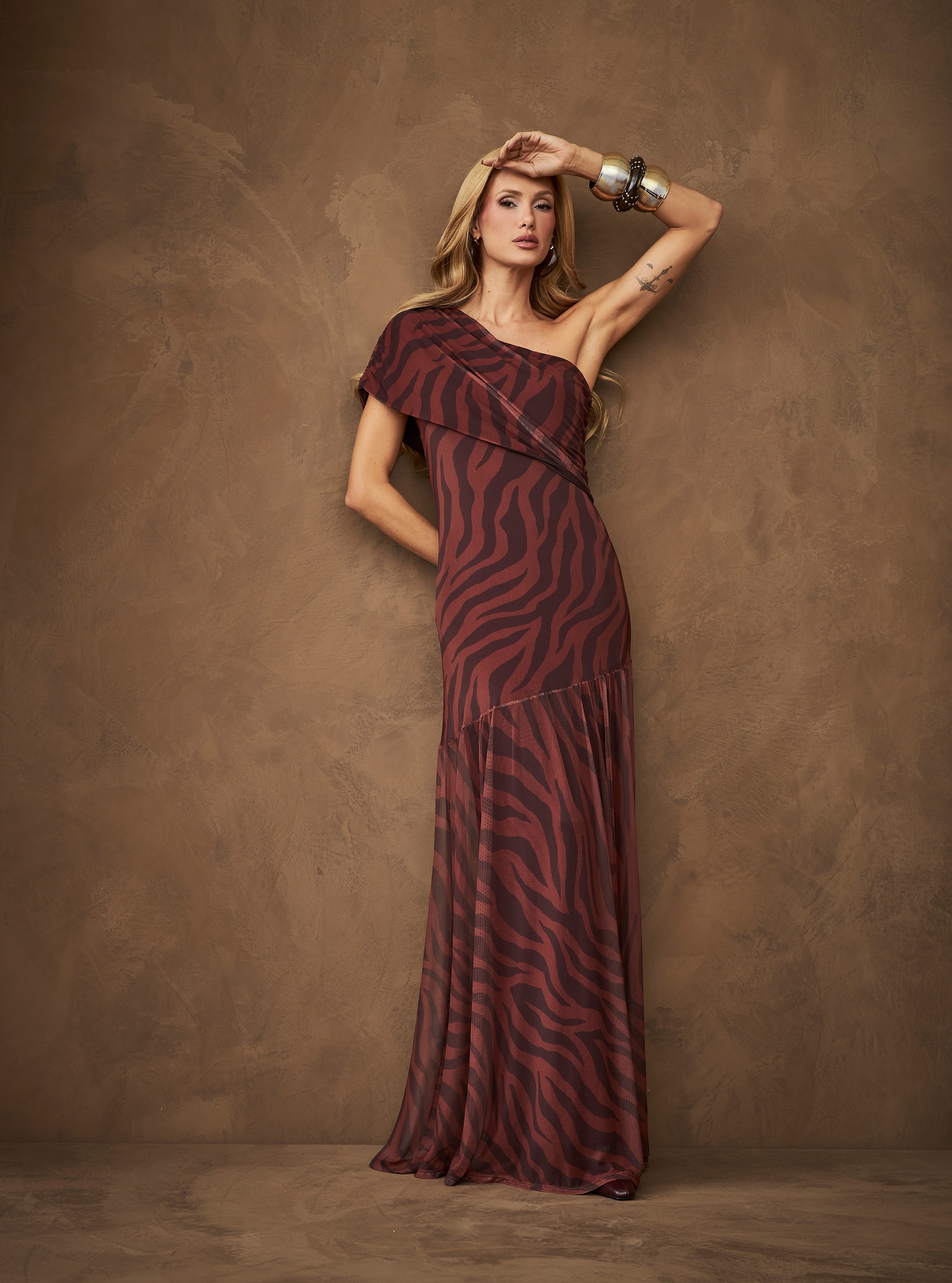 Vestido longo em tule que traduz elegância e sofisticação com um toque moderno. A peça apresenta estampa marcante que valoriza o visual, aliada a uma modelagem que se ajusta ao corpo na medida certa, destacando a silhueta com feminilidade. O decote assimétrico com sobreposição traz um charme contemporâneo e diferenciado, enquanto a saia ampla com recorte cria movimento leve e fluido ao caminhar. Um vestido imponente e refinado, perfeito para ocasiões especiais onde o destaque é garantido.