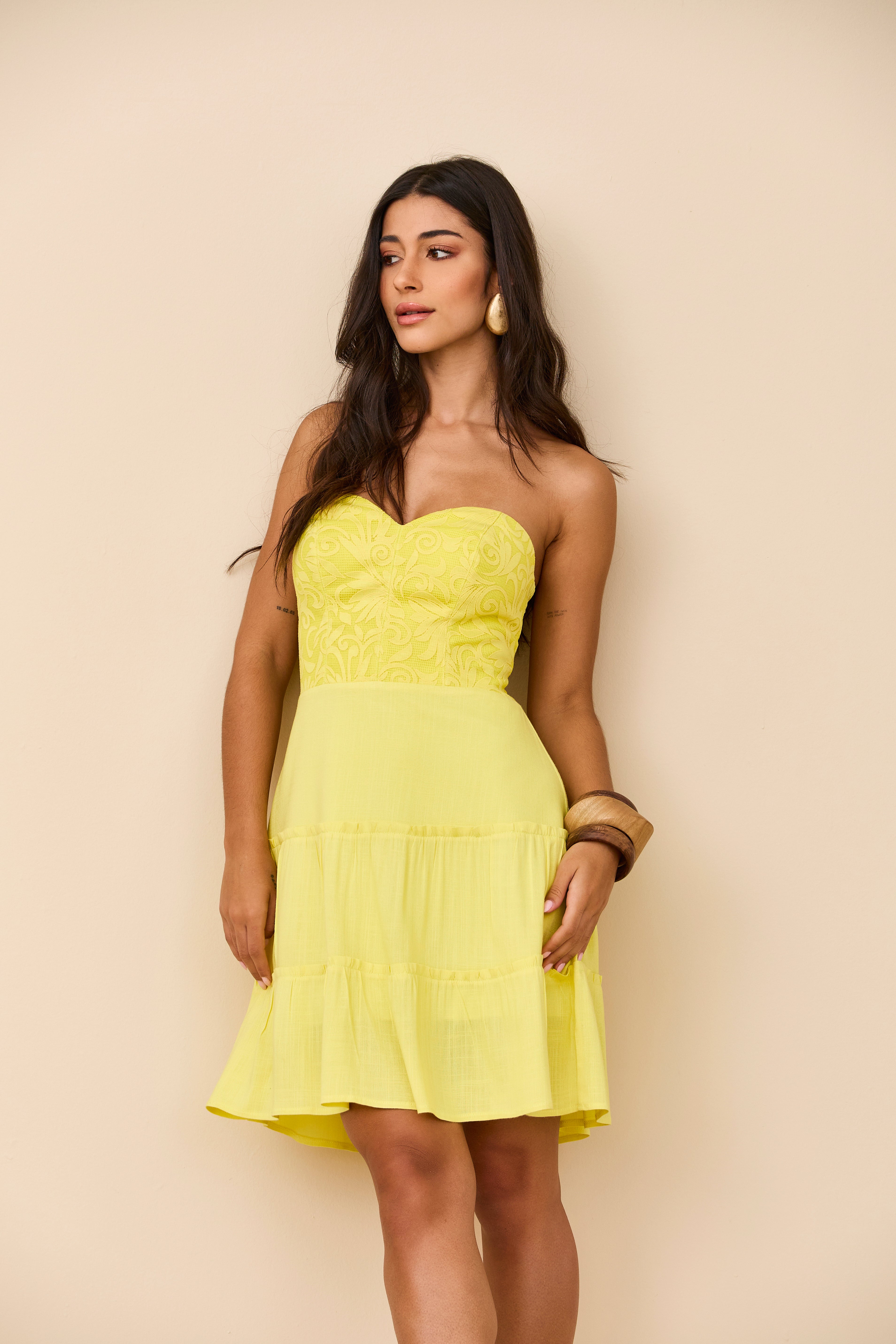 Vestido curto tomara que caia, no tom amarelo, com busto em renda delicada e tecido fluido e leve. Acompanha alças removíveis, permitindo diferentes formas de uso. Uma peça charmosa e feminina, perfeita para dias ensolarados e ocasiões especiais.