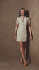 Vestido curto de mangas curtas no tom bege, elegante e moderno, com gola clássica e zíper frontal que traz praticidade e um toque contemporâneo ao design. Os bolsos cargo aparecem de forma sofisticada, equilibrando o estilo utilitário com a proposta refinada da peça. Os punhos das mangas em tons terrosos acrescentam um detalhe delicado e harmonioso, valorizando o visual com sutileza. Um vestido versátil e cheio de estilo, perfeito para produções elegantes com personalidade.