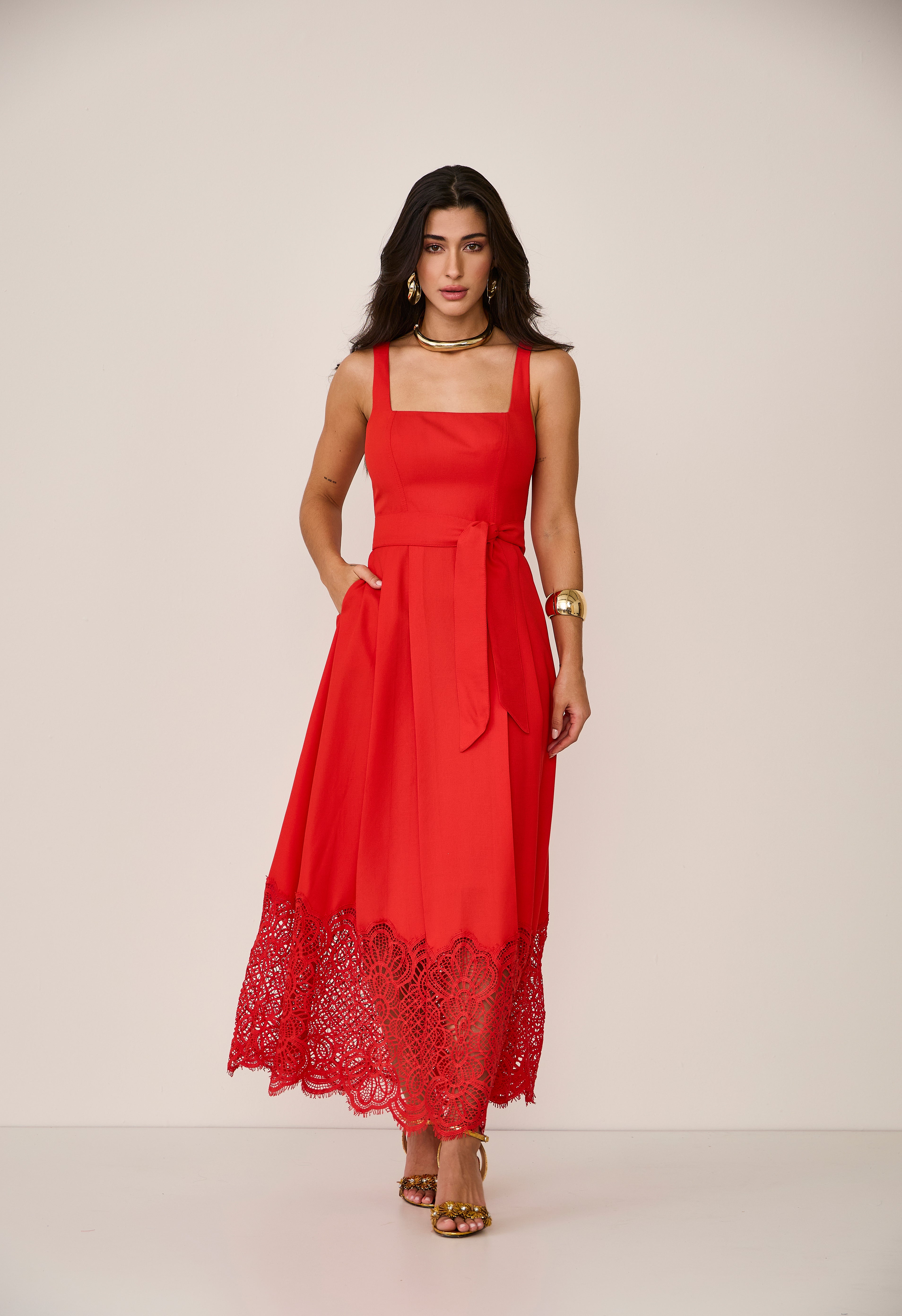 Vestido midi vermelho de alças, com modelagem elegante e faixa que valoriza a cintura. Possui barrado em renda, que adiciona um toque chique e sofisticado à peça. Perfeito para ocasiões especiais.